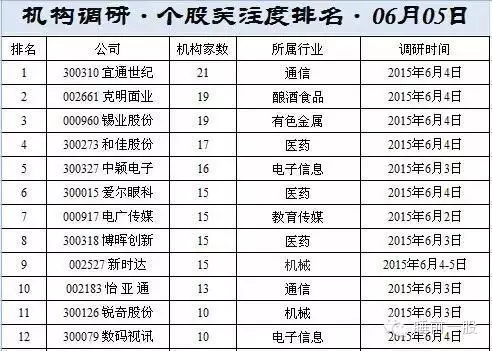 06月05日,在投资者关系活动表中披露受到投资机构调研的上市公司共47家,分别是:腾邦国际、爱尔眼科、双星新材、中颖电子、科林环保、艾比森、电广传媒、民和股份、和佳股份、国光股份、宝鹰股份、博晖创新、阳普医疗、怡亚通、新时达、海鸥卫浴、苏州固锝、中泰化学、赞宇科技、华昌化工、宏达高科、宜通世纪、天和防务、宜昌交运、四川美丰、长春高新、锐奇股份、克明面业、锡业股份、大东南、德赛电池、新时达、大华股份、环能科技、数码视讯、慈星股份、丰东股份、山东章鼓、理工监测、朗姿股份、天兴仪表、久其软件、博实股份、新北洋、獐子岛、圣农发展、浙富控股、威尔泰。