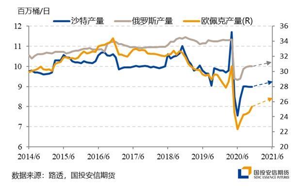 图为OPEC、沙特、俄罗斯产量走势及预估