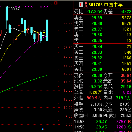周二中国中车(601766)股价大幅下挫,全天振幅达20%。截止收盘,中国中车报29.38元跌9.32%。换手达7.1%,全天成交近500亿元。用一个段子概括就是:今天想试试运气,开盘挂中国中车涨停价买入,兴奋地等着十个板,芭比,五分钟跌了5%,现已深套20%,本来是想上车和大家狂欢的,没想到上车一看,车上坐的都是要饭的,外面看着挺豪华的,进来一看整个一绿皮车,说好的十个板呢?我怎么办?跳车肯定伤着肉,继续坐车不知道会不会开到集中营,救命呀!