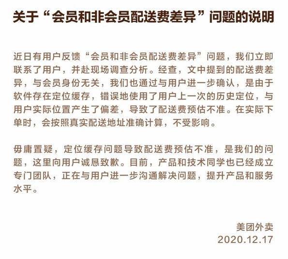 美团被曝杀熟会员配送费更高 公司致歉:系定位缓存偏差导致