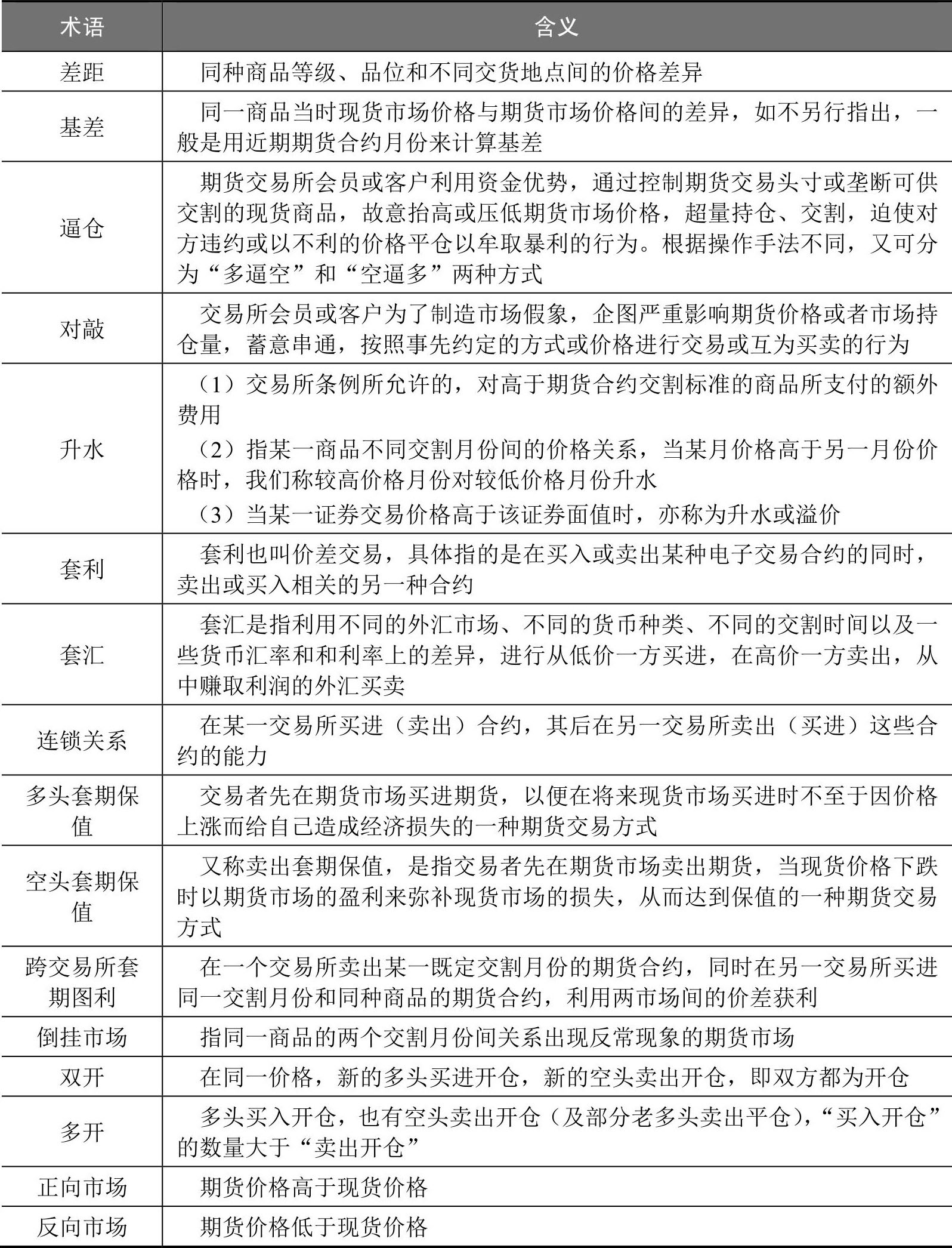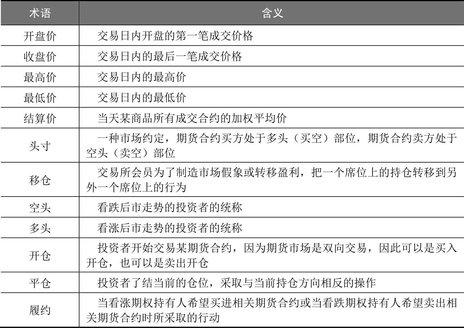 投资者进入期货市场,就一定要了解一些期货市场的专用术语,下面介绍一些比较基本的内容,如表1-2所示。
