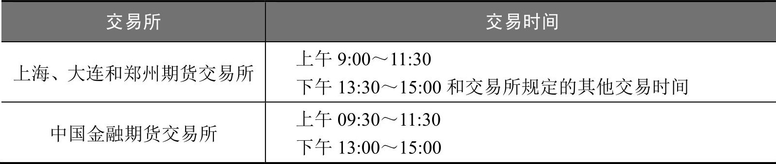 我国期货的交易时间也就是交易所的开市时间,目前有4个交易所,如表1-1所示为我国四大交易所的交易时间。