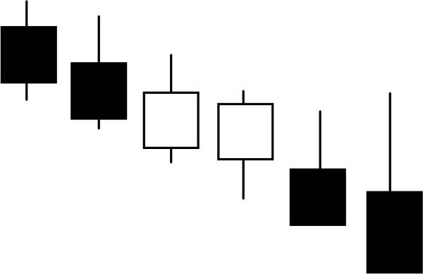 落日残阳趋势是下跌过程中一种阴线阳线夹杂的形态,如同上涨过程中不会全部收阳一样,在下跌过程中也会阴线阳线夹杂出现,其原因有两点,一是空方不会持续打压,会有缓冲期;二来多方也不会坐以待毙,会偶尔发起反攻。