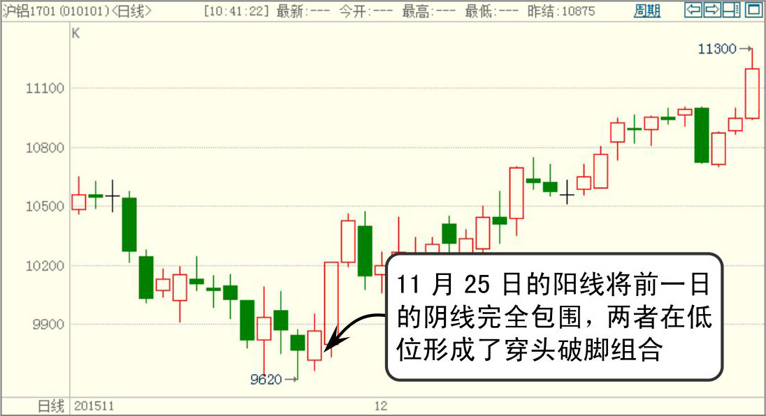 低位穿头破脚组合中的阴线实体较短,完全被后一日的阳线所包围,而阴线是空方实力的证明,后一日的阳线则是在多方拉动下出现的,是多方实力的证明,二者对比,可知此时的空方有黎明前的黑暗之感。