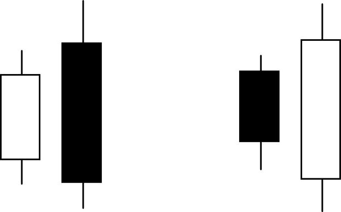 ◆穿头破脚组合穿头破脚组合由2根一阴一阳的K线组成,根据出现该组合的价格走势,分为顶部穿头破脚和低位穿头破脚,如图6-15所示为两种穿头破脚的组合形态。