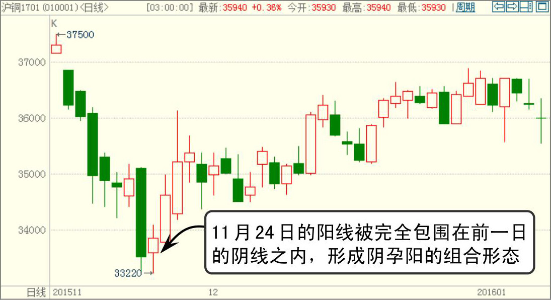 将这两日的K线结合起来看,发现24日的阳线实体被完全包围在23日的阴线之内,两者形成了阴孕阳的组合,且24日价格探出了新低,尾盘时又出现明显拉高,后市反转意味浓烈。