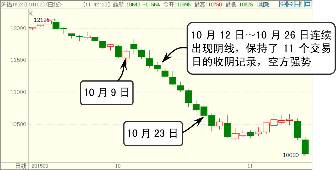 由图中可知,沪锌1701合约的价格在2015年10~11月均处在下跌状态中,在这段下跌走势中,阴线与阳线同时出现,但是通过对比可以明显发现,阴线的实体相对阳线而言要更长,表示虽然盘内的多方从未放弃抵抗,但是控盘权仍牢牢把握在空方,间杂出现的阳线对于价格走势并没有起到反转的作用。