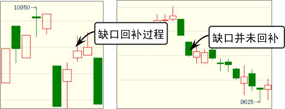 跳空形态跳空是指两个交易日的K线之间出现较大的空隙,多是因为后一交易日低开低走或者高开高走形成的,在价格运行过程中,出现跳空现象表示某一方的力量集中性释放,但是在跳空出现之后,价格一般会在短时间内回补,即将前面形成的缺口补上,补上之后价格继续沿着之前的走势运行,当然,也有缺口之后不回补的现象,如图6-17所示。