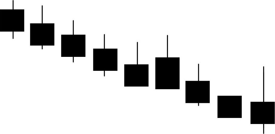 九阴白骨爪形态很好理解,在价格运行过程中,出现连续的9根阴线,表示在空方的大势打压下,多方完全没有还手之力,这种组合形态一般出现在价格下跌的前期或中期,并且在跌破横盘调整的时候最易出现,此时正是空方实力最强的时候,到了后期,多方缓过神来,空方就再难以发动如此大规模的打压,如图6-18所示为九阴白骨爪的形态。