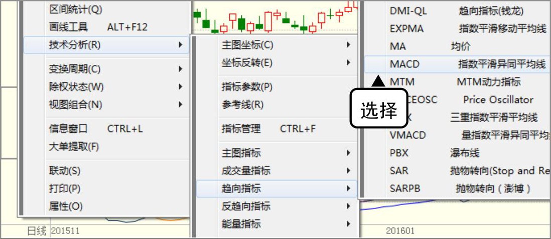 步骤02 设置完成之后,会发现成交量指标为默认显示,另外一项指标并不是MACD指标,此时在第3个视图的空白处单击鼠标右键,选择“技术分析/趋向指标/MACD”命令即可将该指标设置为MACD指标,见图6-23。