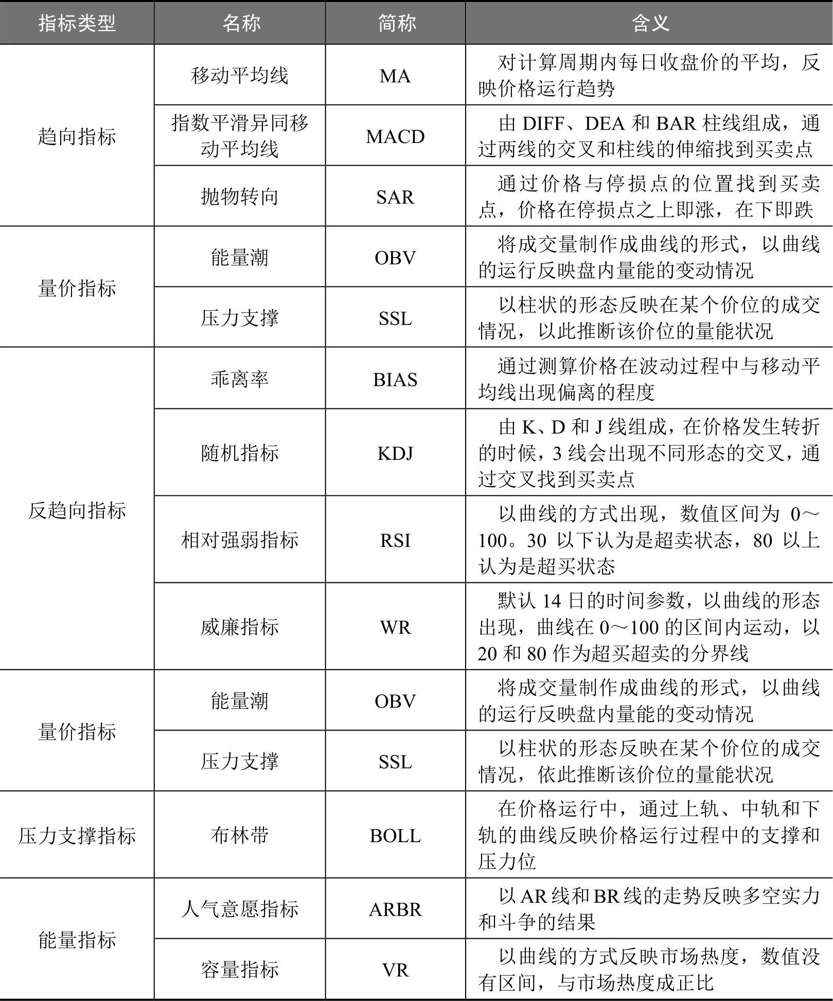 技术指标的数量有很多,不同的技术指标具体有不同的含义,对价格的判断有不同的标准和方法,下面来了解一些技术指标的分类,如表6-1所示。