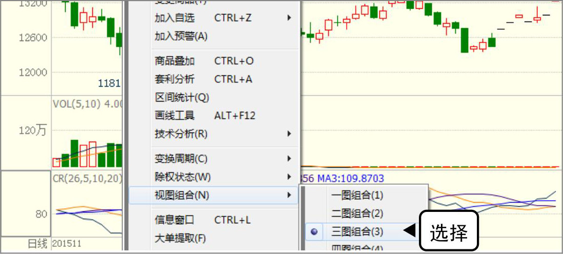 步骤01 以博易大师为例,打开博易大师软件后,在K线图空白处单击鼠标右键,在弹出的快捷菜单中选择“视图组合/三图组合”命令,将主界面设置为3图显示的形态,见图6-22。