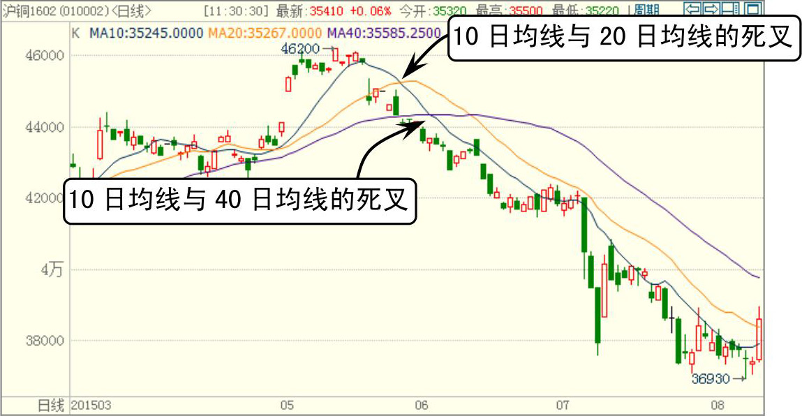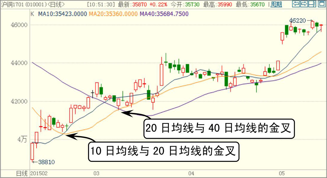 如图7-1所示为沪铜1701合约2015年2~5月的走势图,在走势图中,可以看出图中设置的MA指标周期分别为10日、20日和40日。在这几条均线中,40日均线的前期走势为下行,说明前期价格有过较大幅度的下跌,而同时段的10日均线和20日均线已经处在上行走势。在2月11日时,10日均线自下而上穿过了20日均线,发出了短期上涨的信号。