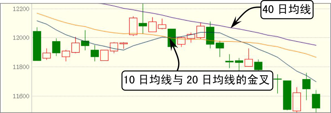 金叉是买入信号,在下跌行情中会配合反弹走势出现,表示反弹的开始,但是下跌行情中的金叉一般都出现在短期均线之间,中期均线因为计算的时间周期较长,一般很少参与其中,除非此次反弹时间较长,如图7-2所示为下跌行情中的金叉现象。
