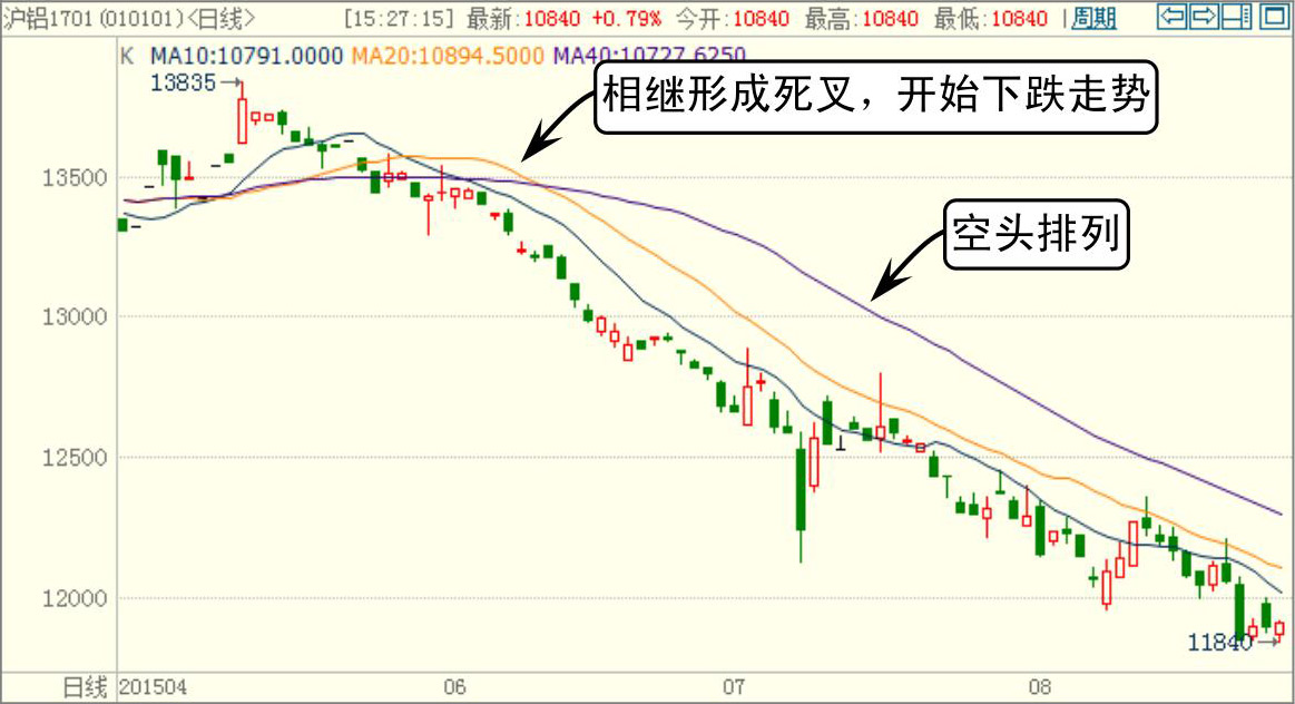 在沪铝1701合约的价格走势图中,2015年4~5月底,10日均线、20日均线和40日均线在高位互相交叉,走势混乱,进入6月,10日K线相继下穿20日和40日均线,形成死叉,开启了价格下跌的序幕,如图7-5所示。