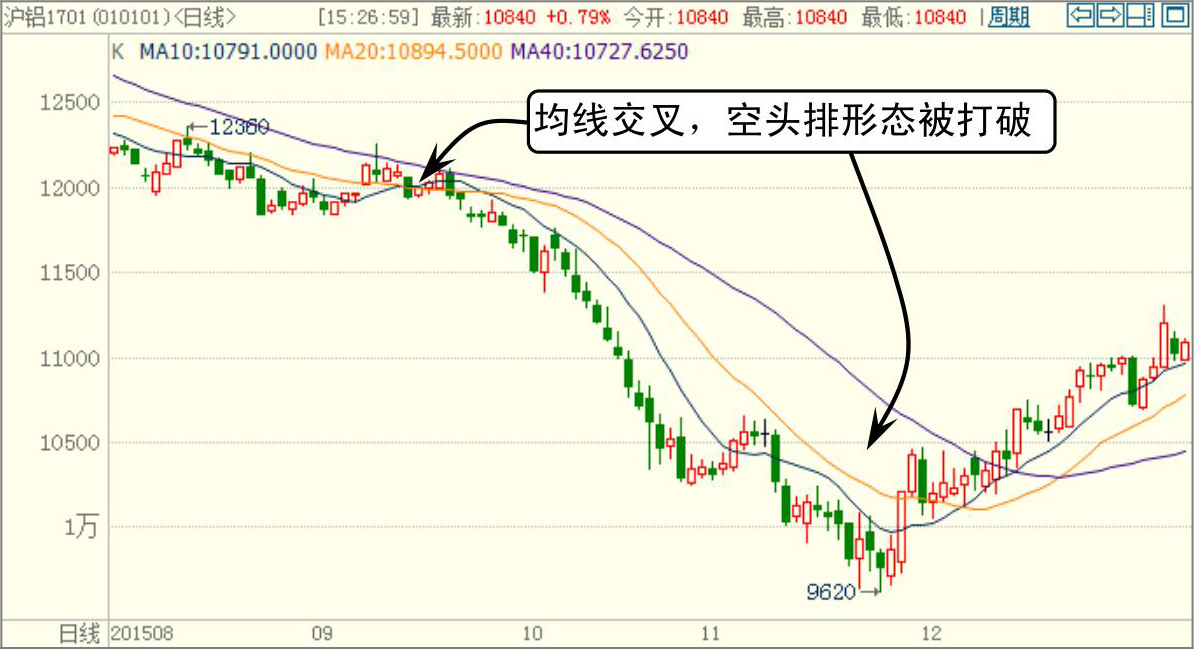 在沪铝1701合约2015年8~12月这段时间的走势中,9月中旬前的空头排形态因为10日均线上行穿过20日均线打破,此后价格开始了一场幅度不大的反弹。反弹结束后,价格继续下跌,再次形成空头排形态,12月初,3条均线相继上穿,结束了这一次的空头排形态。