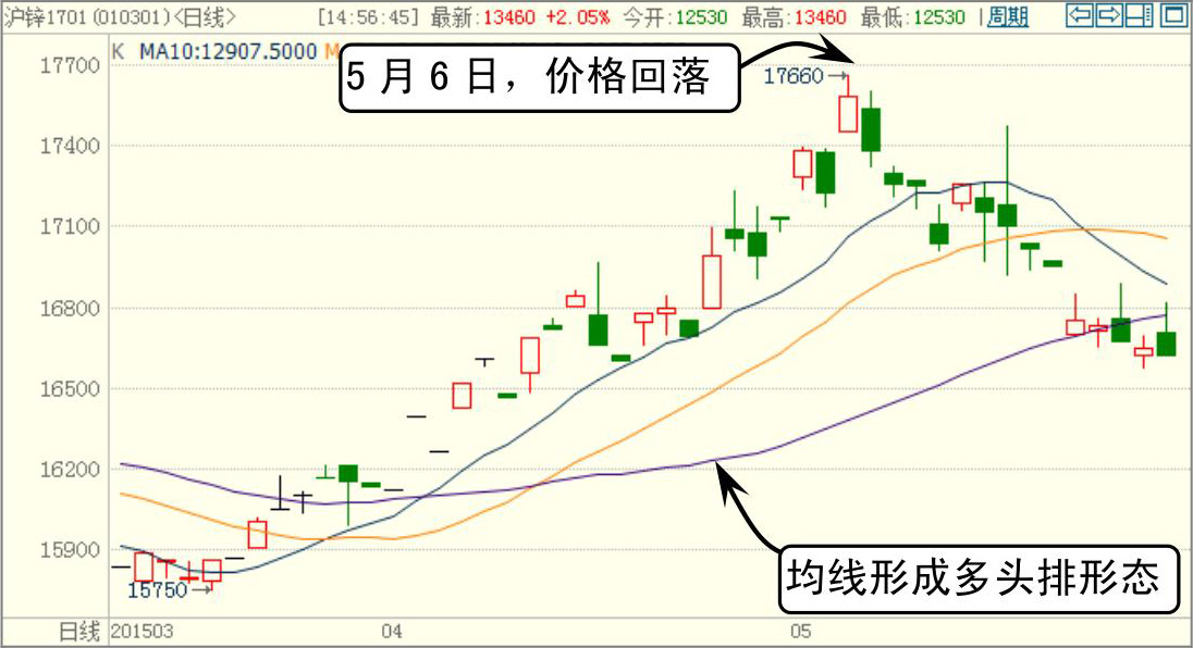 在沪锌1701合约的价格走势图中,2015年4月初10日均线、20日均线与40日均线相继形成金叉,价格开始了一波上涨走势,并且在价格上涨过程中,均线之间的距离逐渐拉开,形成了有序排列的多头排形态,如图7-4所示。