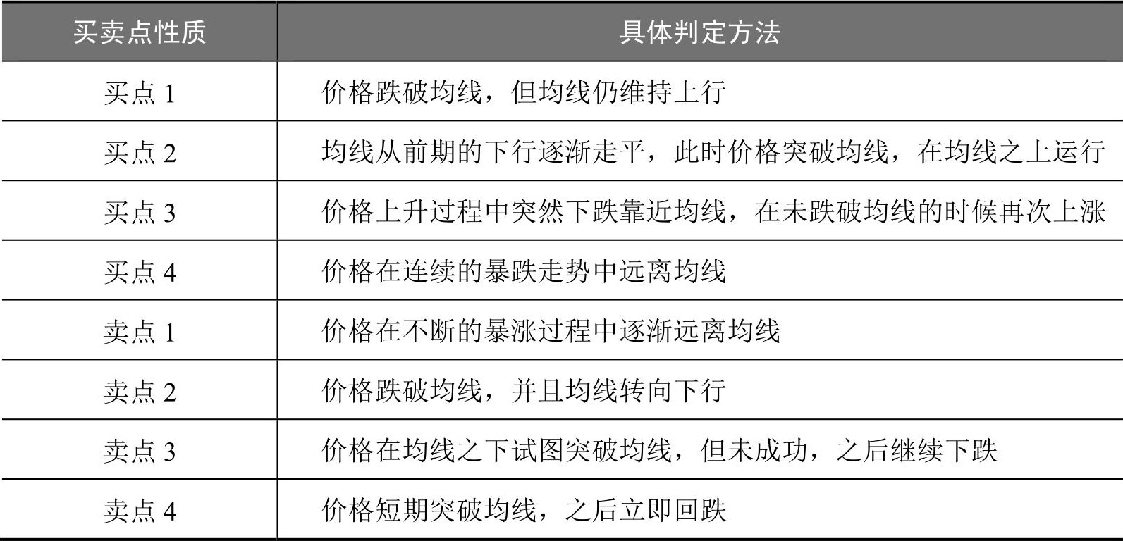 葛兰威尔是均线之父,他在研究出均线理论的同时,还提出了八大买卖法则,是通过均线与价格的位置关系找出买卖点的法则,如表7-1所示为法则的具体内容。
