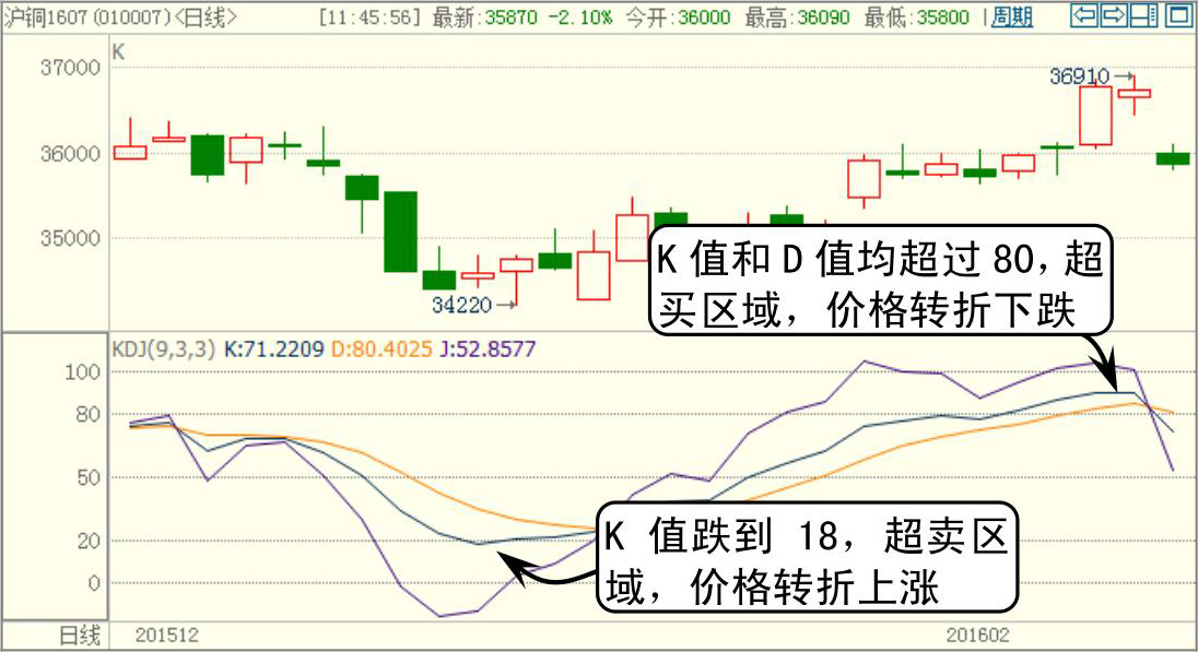 当K值和D值下跌到20以下时,表示当前市场已经出现了超卖现象,后市价格上涨的可能性较大,当K值和D值上涨超过80时,表示当前市场出现了超买现象,后市价格下跌的可能性较大,如图7-18所示。