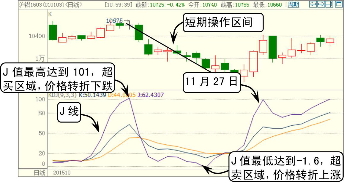 J值在0~100的数值区间内价格会持续走势J值的变动幅度比较大,而0和100是超卖超买区间的临界值,因此,当价格位于临界值区间内时,价格一般不会发生较大的变化,如图7-17所示的11月27日J值达到99,很接近临界值,但是下一交易日并未继续突破,因此价格在一日的调整之后继续上涨。
