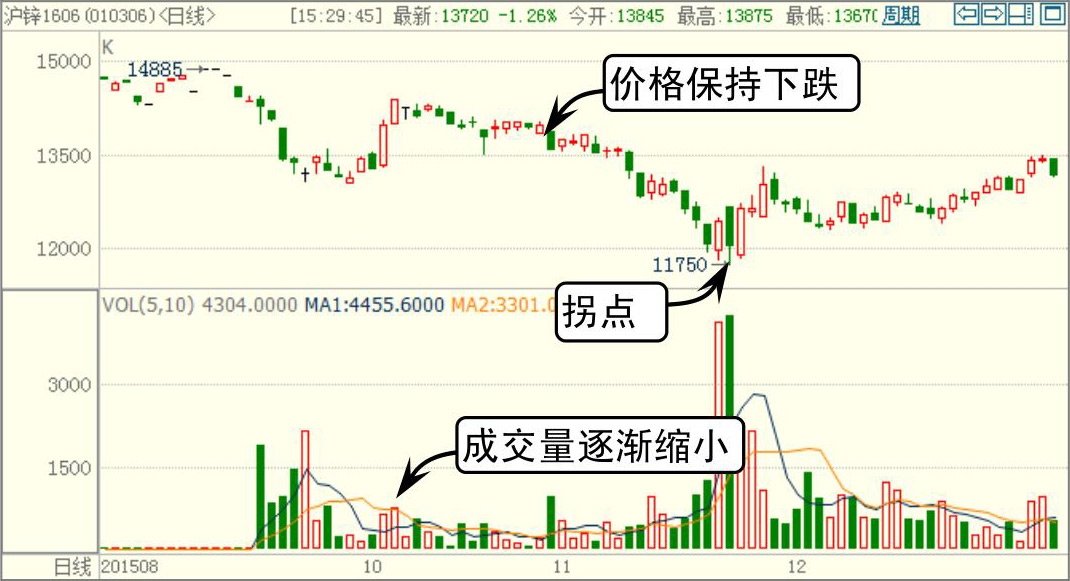 ◆ 价跌而量不涨: 价格仍然处在下跌状态中,而成交量逐渐缩小,表示盘内的做空量能已经逐渐挥发,价格下跌的走势会逐渐结束,拐点会尾随出现,如图8-15所示。