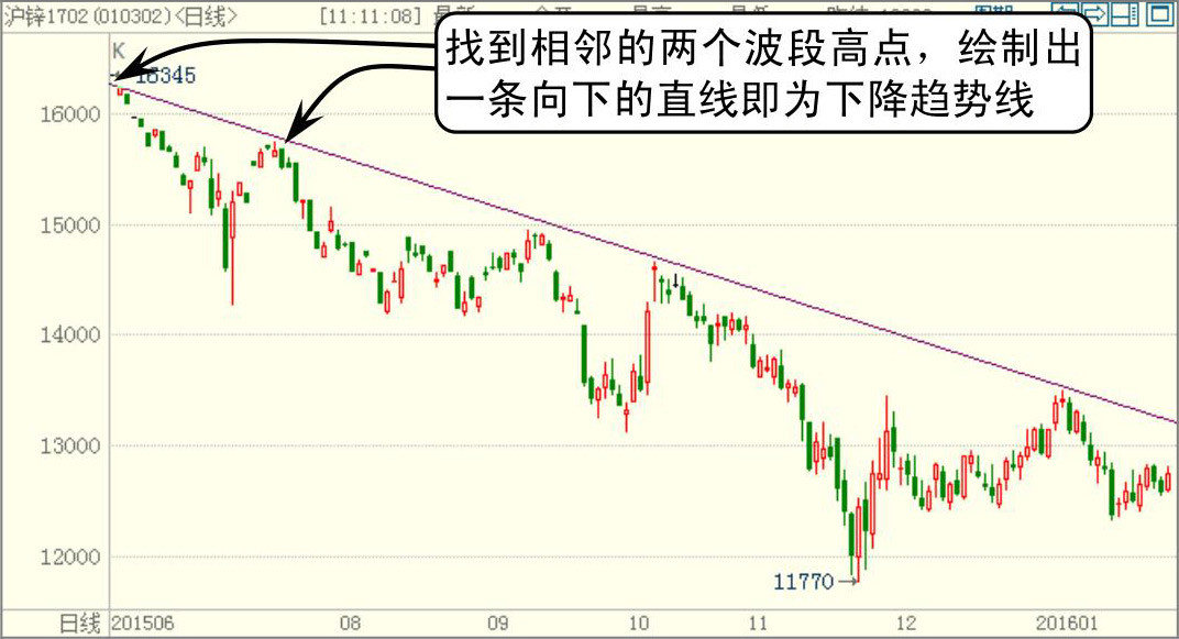 趋势线的绘制比较简单,上升趋势中根据趋势内两个相邻的低点即可绘制,水平趋势中也是根据相邻的两个低点绘制出的直线即为水平线,下降趋势中根据两个相邻的高点连线得出的直线即为下降趋势线,如图8-6所示为下降趋势线。