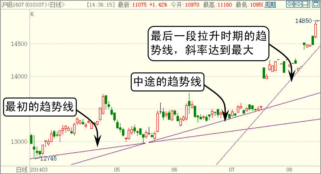 在长期上涨趋势中,最初上涨趋势线的斜率比较小,随着多方能量的凝聚,上涨速度加快,斜率也会逐渐变大,到最后一段拉升过程的时候,可能会出现一段急速的趋势线,此时的斜率达到最大,如图8-10所示上涨趋势中不同阶段趋势线斜率的变化。