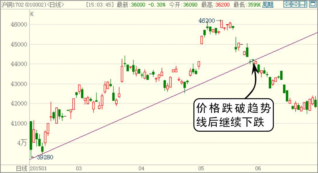 趋势线的突(跌)破根据突(跌)破后的走势可以分为假突(跌)破和有效突(跌)破,假突(跌)破是指价格短暂突(跌)破后继续沿着趋势线的方向运行,而有效突(跌)破即为价格开始了新的、与前趋势方向相反的走势,如图8-12所示为有效跌破趋势线的形态。