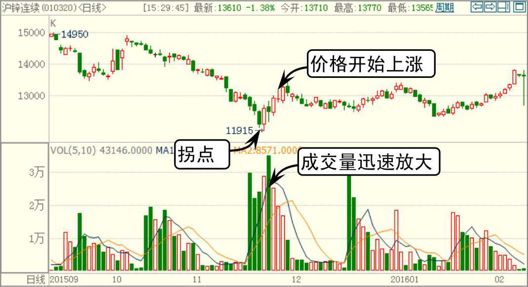 除了以上的信号外,拐点出现的同时还会配合成交量的变化,以此对价格的转折进行确认。