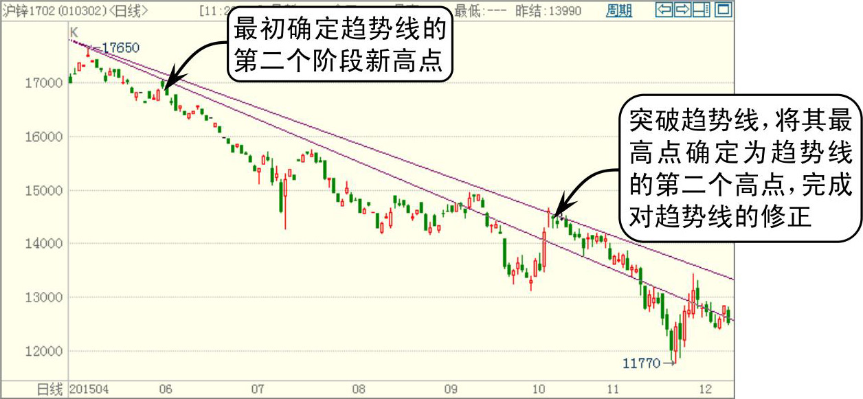 在下降趋势中,当价格反弹突破下降趋势线,短时间突破之后价格继续下跌,此时要将突破高点调整为确定趋势线的第二个点,以保证K线运行在趋势线之下,如图8-7所示。