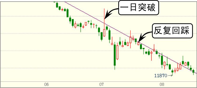 价格在进行突(跌)破趋势线的时候,如果上面的条件未能满足,即为假突(跌)破,例如某一日的K线突破了趋势线或者价格始终在趋势线上回踩而没有实质性的上涨或下跌,如图8-13所示。