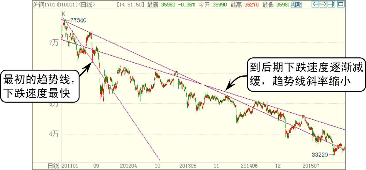 在下降趋势中,最初下跌绘制出的趋势线斜率一般是最大的,此时空方投入了较大量能来打压价格,因此下跌速度较快,随后跌势已定,空方投入的量能会逐渐减少,下跌速度会稍微减缓,到下跌的最后一段时间斜率达到最低,如图8-11所示。