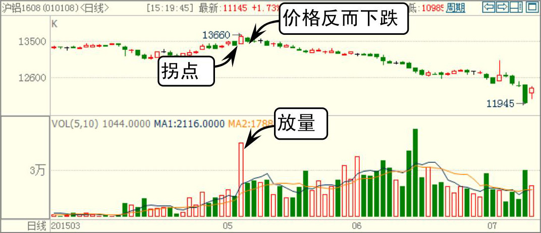 ◆ 放量而价不涨: 这种现象多出现在价格上涨的末期,在这段时间成交量出现明显放大,而相应的价格却没有出现太大涨幅,表示多空双方在积极换手,促成成交量的放大,此种现象出现,说明多方并没有继续拉升价格的愿望或者在空方的打压下无法继续维持价格,此时拐点出现的可能性很大,如图8-14所示。