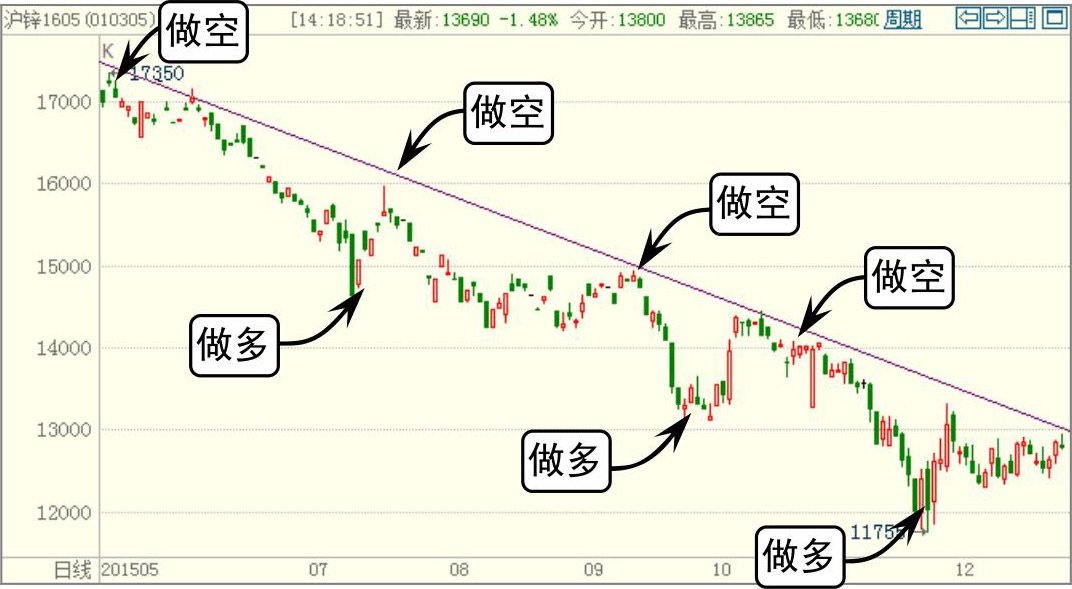 在下降趋势中的波段操作方法很简单,当价格接近下降趋势线的时候,进行做空,当价格大跌远离趋势线时进行做多,将一段中长期的下跌走势变为多个波段进行操作;在上升趋势中的波段操作方法一样,当价格靠近趋势线的时候进行做多,远离趋势线的时候做空,这样的操作方法可以扩大盈利空间。