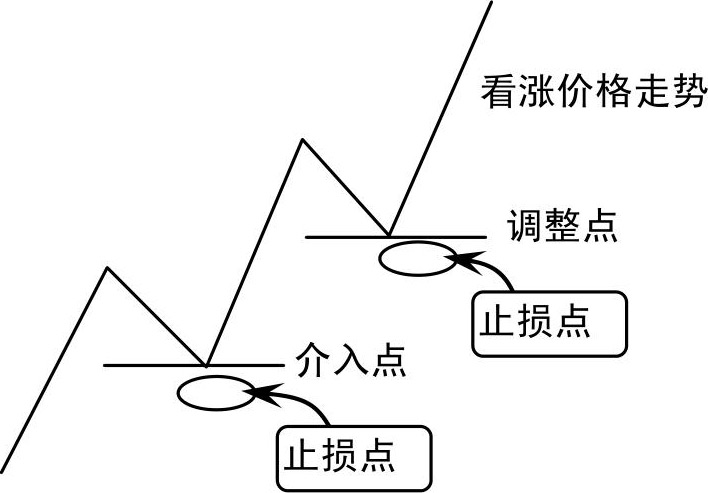 为了防止当损失发生的时候,投资者不能及时止损,可在最初开始交易的时候便设立好止损位,一旦市场价格达到这个价位,便自动提交止损,这样可以避免投资者的主观影响。当然,止损点的设定可以根据价格的走势不断变动,例如价格不断上涨,则止损点的设定也应该不断上移,如图9-6所示。