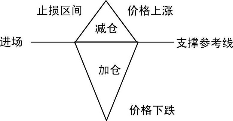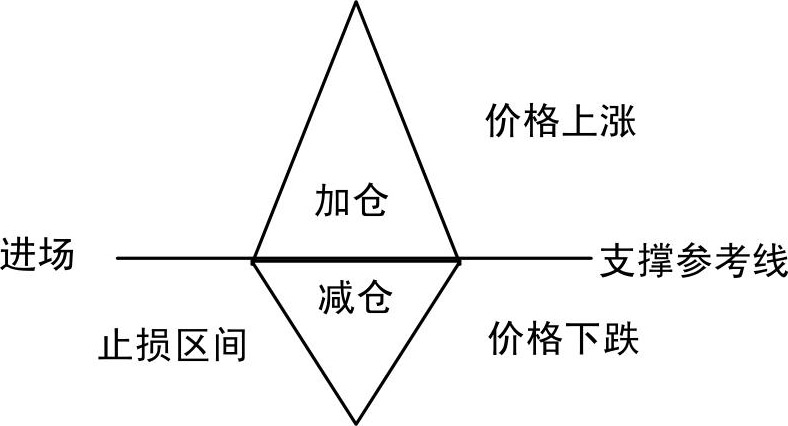 如图9-9所示为做多状态下的金字塔形仓位管理法的示意图。
