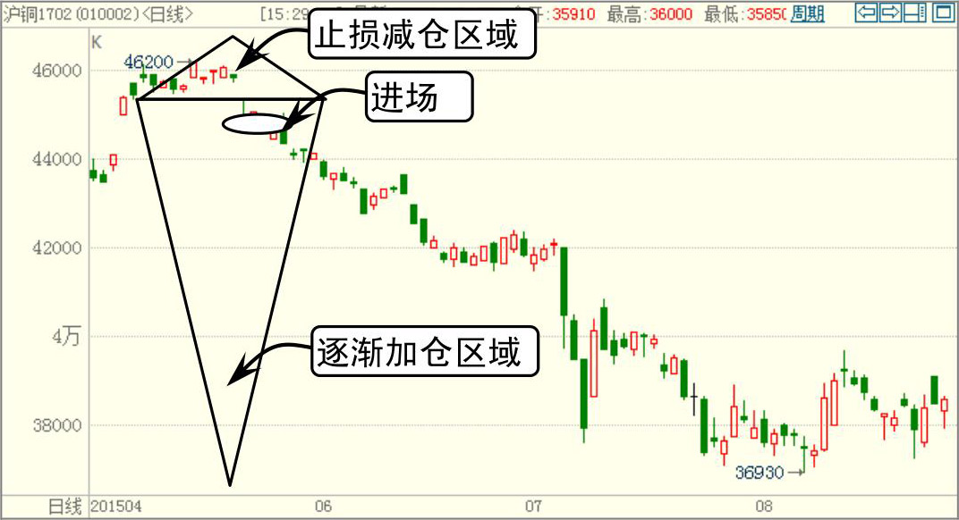 若投资者进行做空操作,金字塔形仓位管理法的应用是一样的。入场后,若价格继续下跌,则以逐渐递减的量增加空头持仓;若价格出现上涨,则逐渐减仓,如图9-11所示。