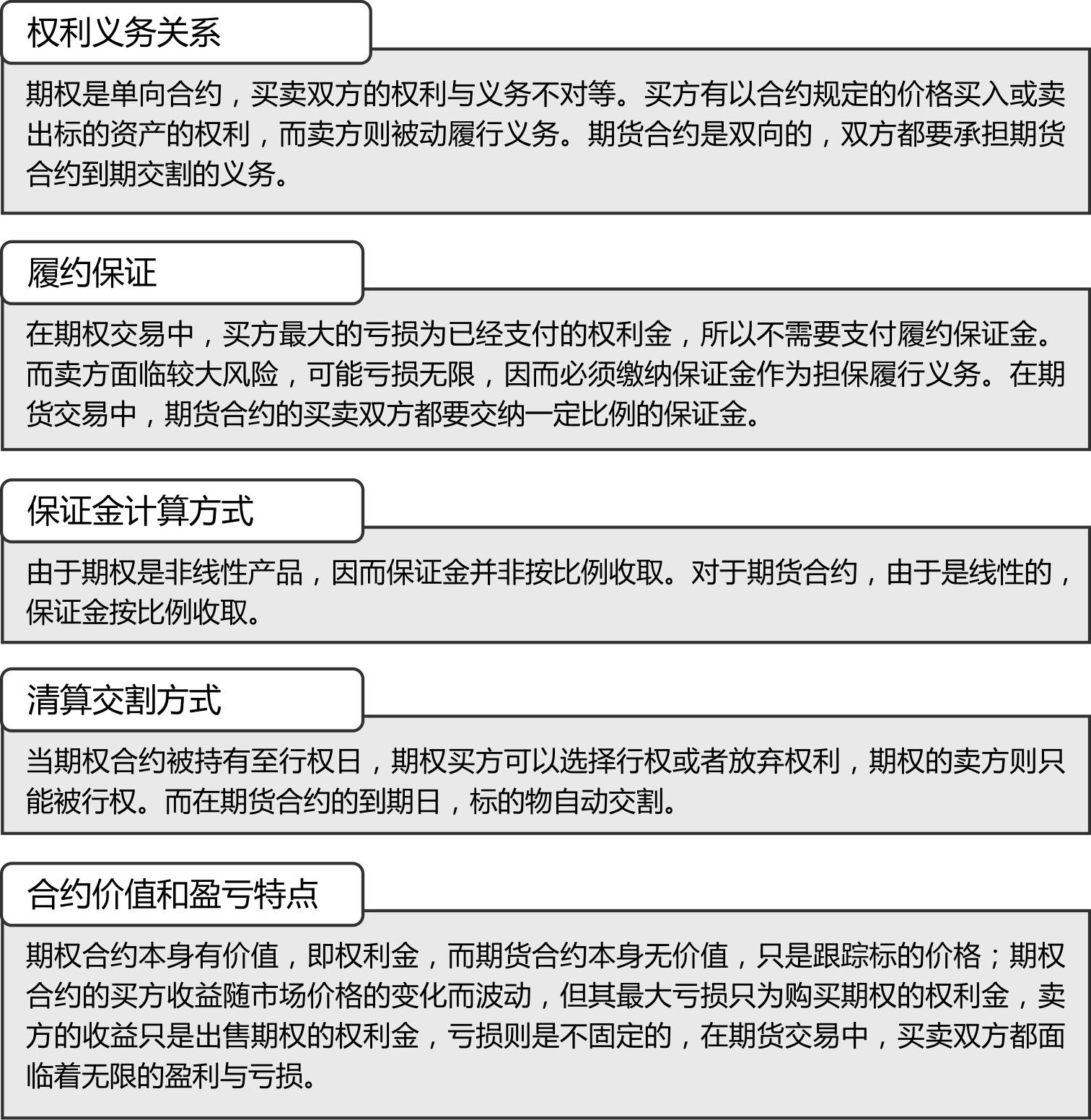 期权与期货一样,都是在有组织的场所进行交易,且都是采用标准化的合约形式,由统一的清算机构清算,都具有杠杆效应,除了这些相同之外,期权与期货有哪些区别呢?具体如图10-2所示。
