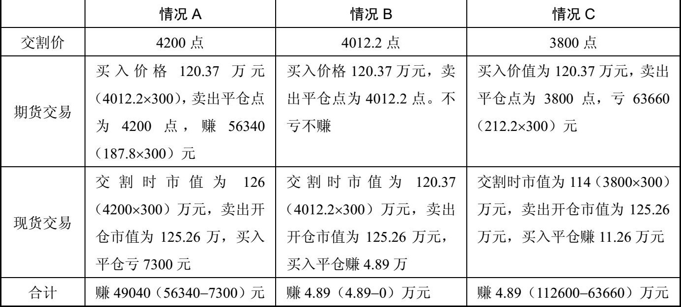 从表5-2中的三种情况来看,相对于初始成交价格4012.2点来说,不论最终股指是涨是跌还是平,最后的结果都是一样的。套利不看它的绝对涨幅或跌幅,而是看相对走势。