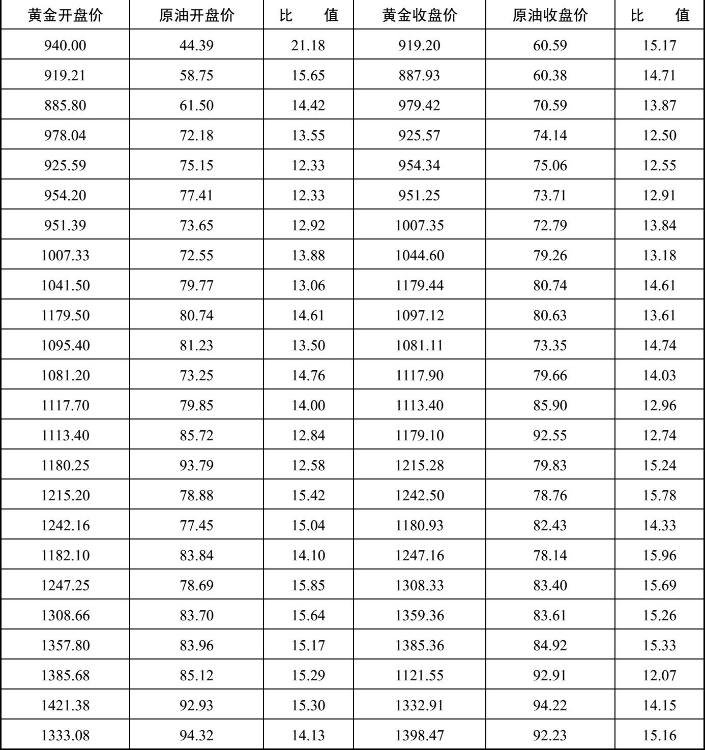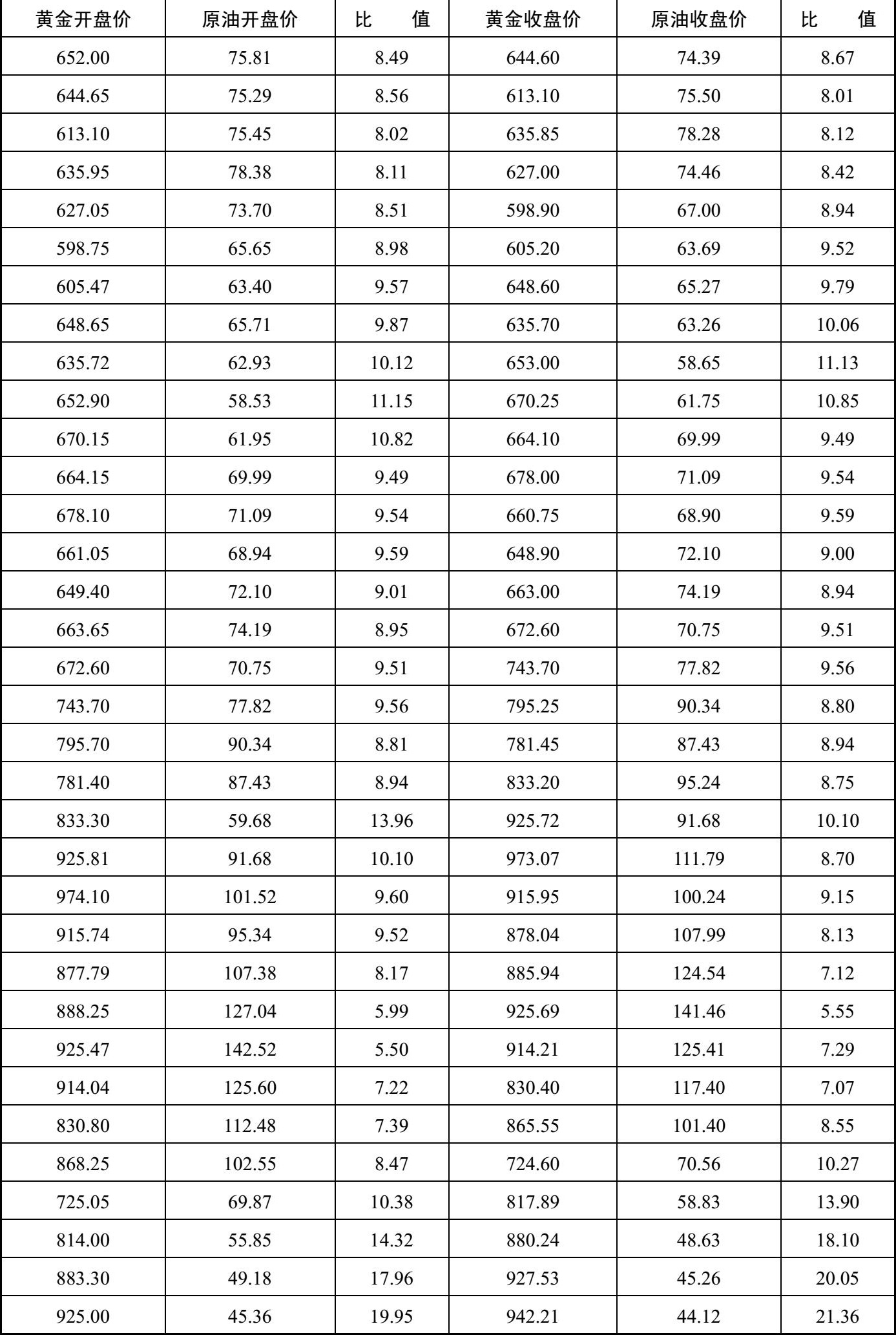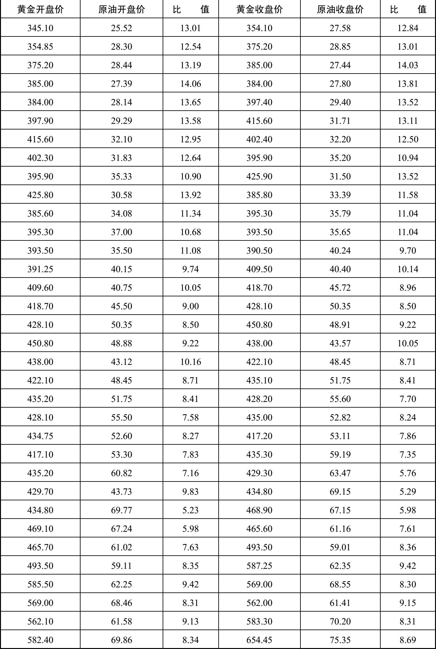 值得我们注意的是,黄金与原油价格的比值分别达到5.76、5.29、5.98和7.61。低于我们买进黄金卖出原油的比值,所以我们的套利在这四个月内是亏损的,这是极正常的现象,我们给出的偏离比值是通过求出平均值再加减标准差,所给出大部分散点集中分部的范围,一定会有一些比值超过我们所给出的范围,落在散点分布图的两端,但我们不需要担心,因为比值的偏离不会永无止境地扩大或缩小下去,到达一定的幅度后,自然要向10.3靠近,它在一定时期将长时间地围绕着这一比值波动下去。