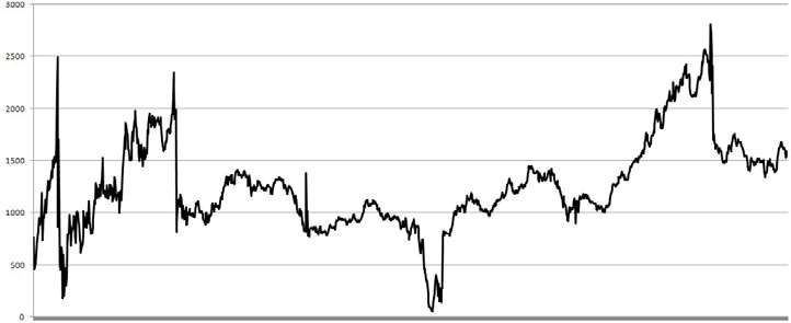 我们来做一个模拟,在上一段的总结中,如果比值偏离在12.52~14.46时,可以进行卖出黄金买进原油的套利交易,按收盘价来看,当黄金的月收盘价为364.20美元,原油的月收盘价为25.84美元,它们的比值为14.09,接近我们给出的卖出黄金与买进原油的极值,那么我们卖出黄金,再买进相同份额的原油。因为它们的比值为14.09,假设黄金与原油的保证金比率相同,我们卖出一张黄金合约,便要买进约14张原油合约。
