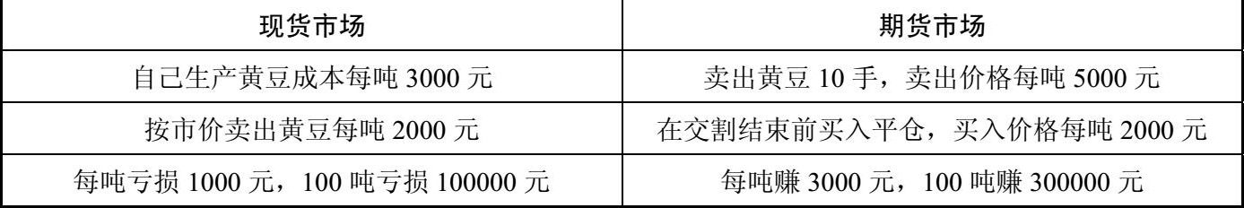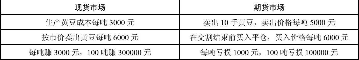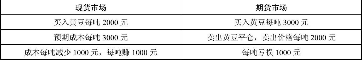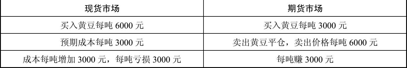 李小三在现货市场上收购黄豆每吨6000元,比他预期的每吨成本高出3000元,也就是成本每吨增加了3000元,每吨亏损3000元。但在期货市场上,在期货价格每吨3000元时买进,期货合约到期时与现货价格相同,那么将手中持有的多单平仓,每吨赚3000元,恰好弥补现货市场中增加的成本,那么他的成本还是每吨3000元,与他的预期成本是一样的。