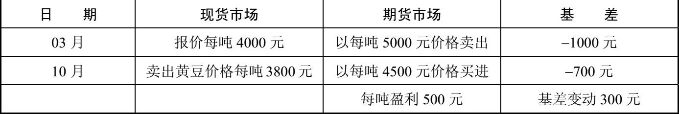 还是王小二在11月会产出100吨黄豆,但现在是03月份,现货报价为每吨4000元,11月份期货报价为每吨5000元。到了10月中旬,现货报价为每吨3800元,期货报价为每吨4500元。王小二的交易明细见表6-7。