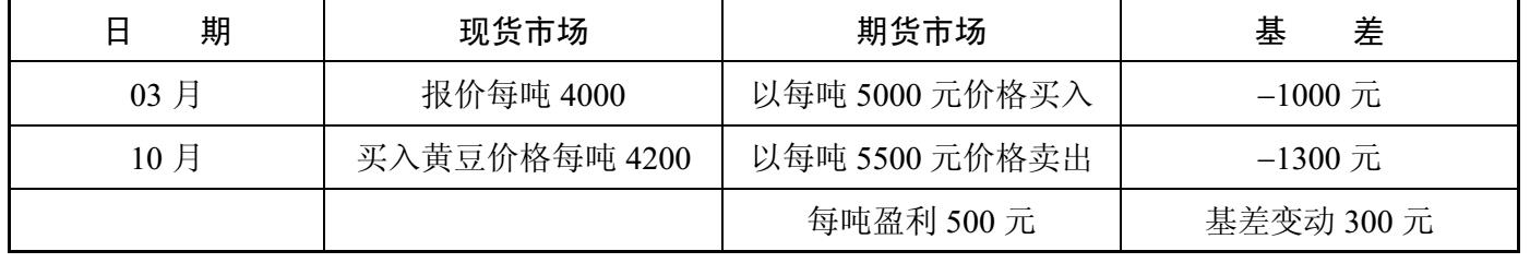 李小三想在11月份收购100吨黄豆,现在是03月份,现货报价每吨4000元,11月份期货报价每吨5000元。他在期货市场上买入10手合约。到了10月中旬,现货报价每吨3500元,期货报价每吨4800元。李小三在两个市场的交易明细见表6-8。