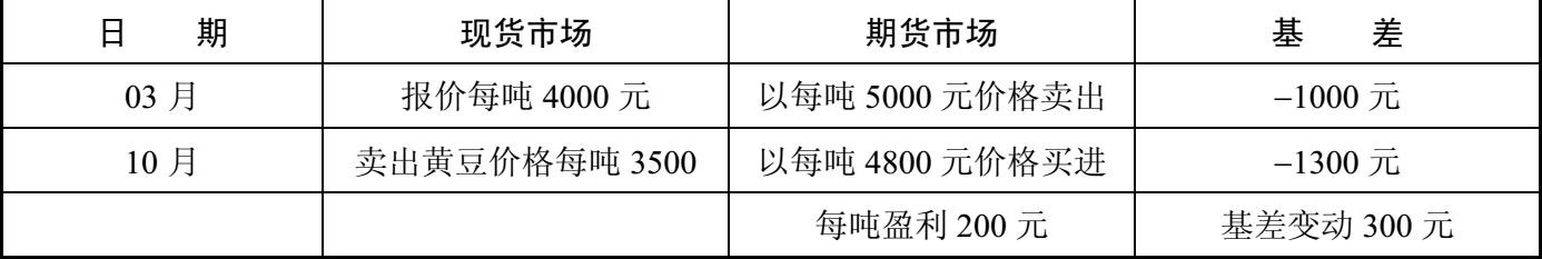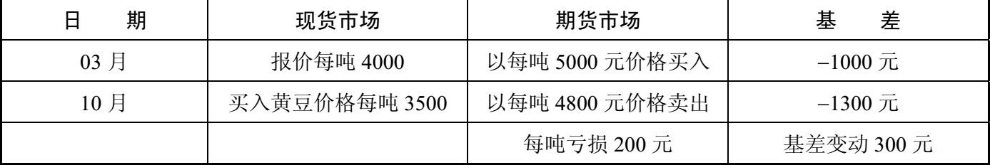 03月份现货报价为每吨4000元,也就是李小三收购的预期价位。但到了10月中旬,他在现货市场上以更低的价格每吨3500元买进,比预期收购价格每吨低了500元。但他却在期货市场上亏损了每吨200元,那么他实际上是以每吨3700元的价格来收购的。与预期价格每吨4000元相比,还是少了300元,即基差变动数额。
