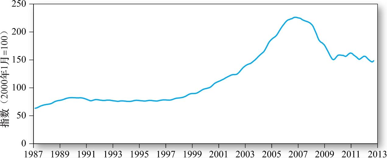 低利率和经济稳定使房地产出现历史性繁荣。从图1-3中可以看出20世纪90年代末房地产价格开始明显上升,且2001年以后利率的大幅下降使得房地产价格加速上升,在1997年后的10年里翻了3倍。
