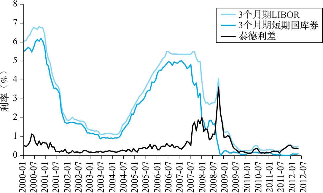 图1-1 短期LIBOR、美国短期国库券利率以及泰德利差