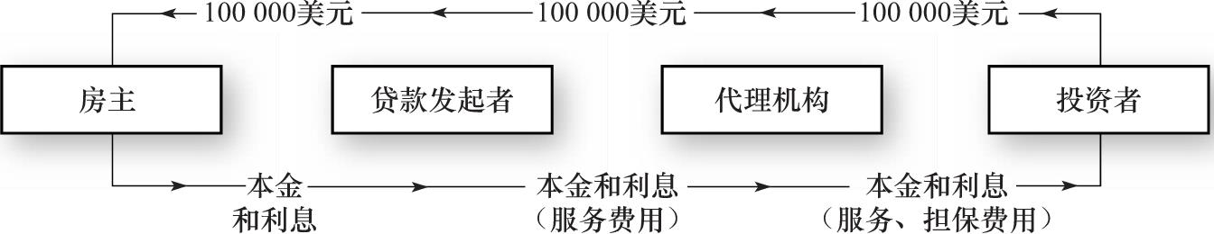 1970年以前,大多数抵押贷款由当地金融机构提供,如附近的储蓄银行和信贷联盟。人们在买房时贷款,然后在很长一段时间(通常是30年)内偿还,因此传统储蓄机构的主要资产就是这些住房贷款的组合,而主要负债是储户的存款。当房利美(FNMA,联邦国民抵押贷款协会)和房地美(FHLMC,联邦住房贷款抵押公司)开始从贷款发起者手中购买抵押贷款并将它们捆绑在一起形成资产池,使其可以像其他金融资产一样交易时,这种格局开始改变。这些资产池实质上代表的是对相应抵押贷款的索取权,后来它们被称为抵押支持证券,这个过程被称为 证券化 (securitization) 。房利美和房地美很快成为抵押贷款市场的巨头,它们大约购买了一半私人抵押贷款。