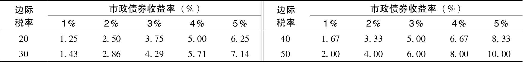 运用式(2-1)或式(2-2)也可以计算出投资者处于何种税率等级时,持有应税债券和市政债券是无差别的。把式(2-2)变形,可以得出使两种债券税后收益率相等的临界税率等级。通过变形,得到