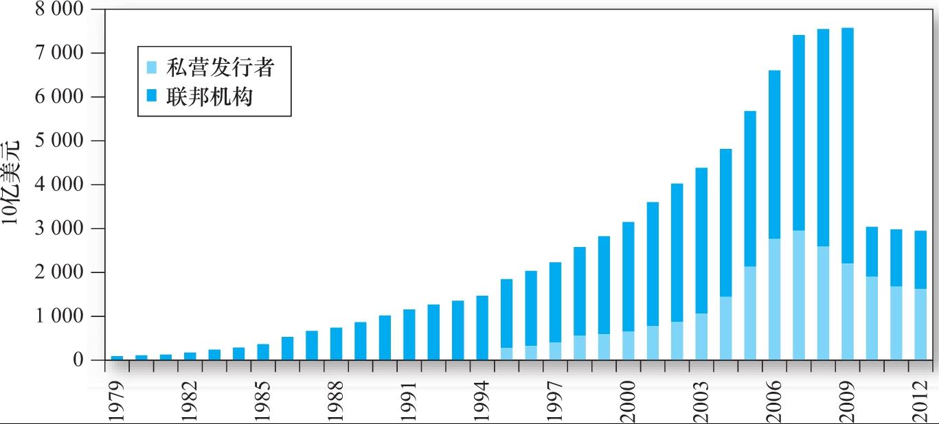 为了使低收入家庭也能买得起房子,房利美和房地美被鼓励购买次级抵押贷款资产池。正如我们在第1章中所看到的,这些贷款最终变成了灾难,银行、对冲基金和其他类型的投资者总共遭受了几万亿美元的损失,而房利美和房地美由于购买次级抵押贷款资产池而损失了几十亿美元。从图2-6可以看出,私营抵押担保证券市场在2009年之后快速萎缩。由于房利美和房地美按照新的协议缩减抵押担保证券的规模,联邦机构发行的抵押担保证券市场也急转直下。同时,现有抵押担保贷款池中健康的贷款全部还清,违约的贷款被从资产池中移出。